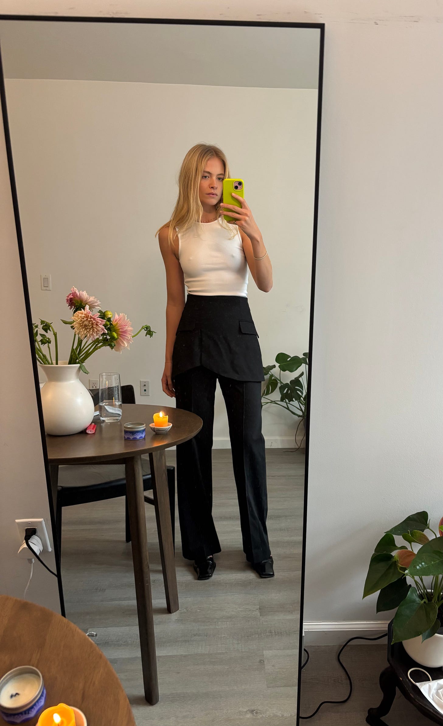 My Mum’s black divorce suit trousers. They’re low rise so no cinching, light as a feather and can be dressed up or down.