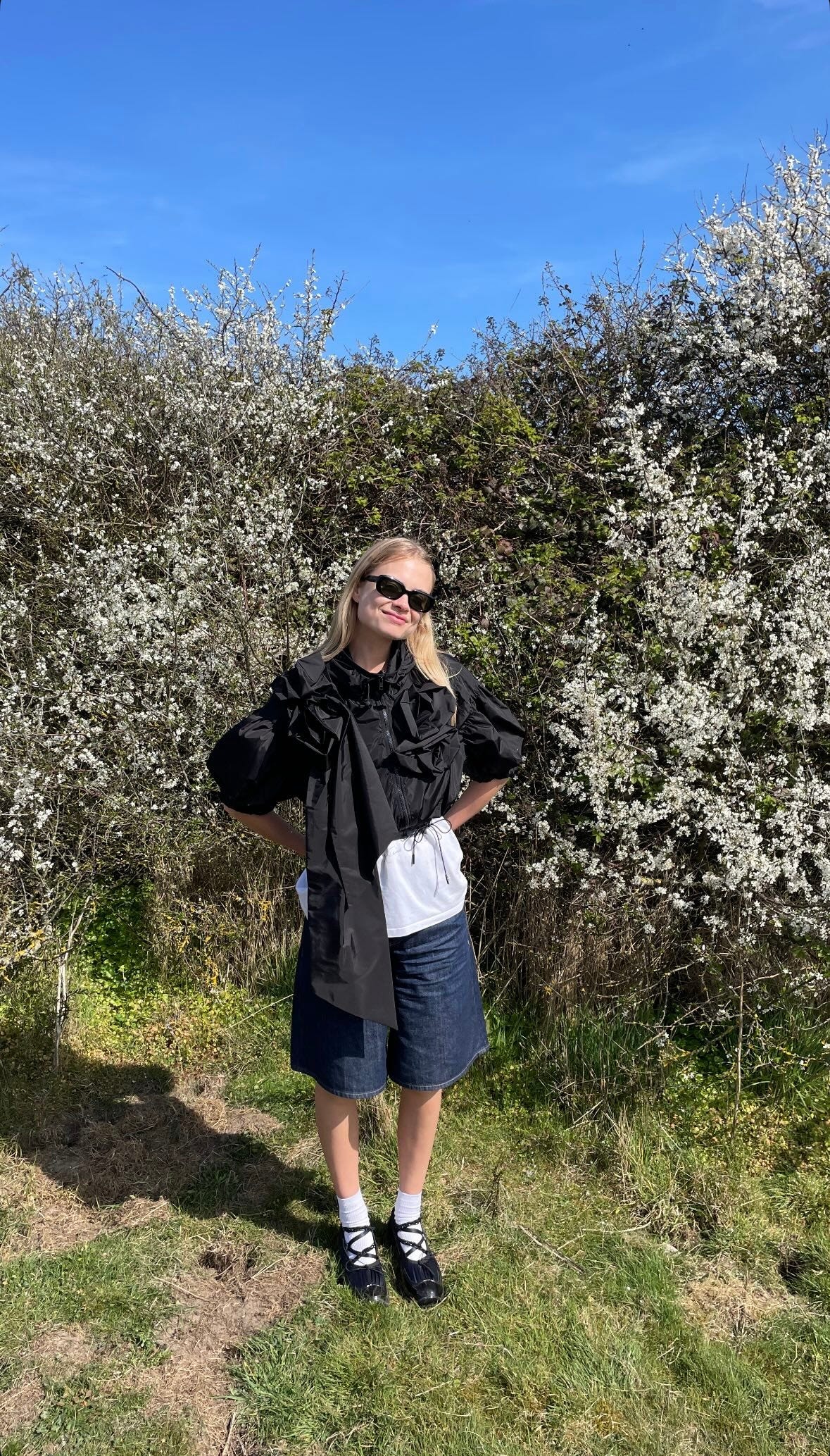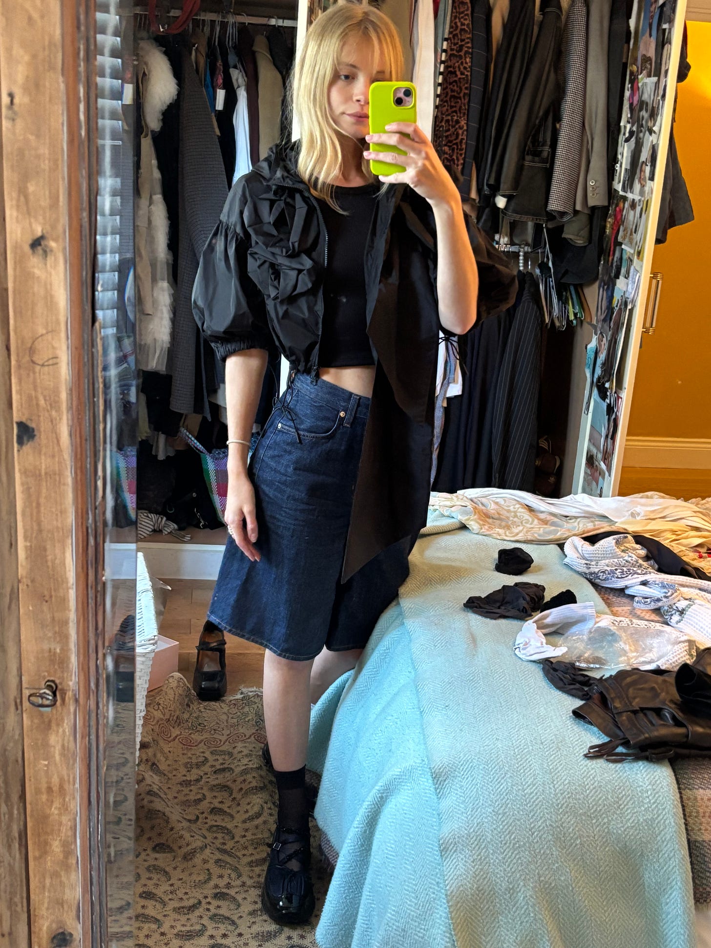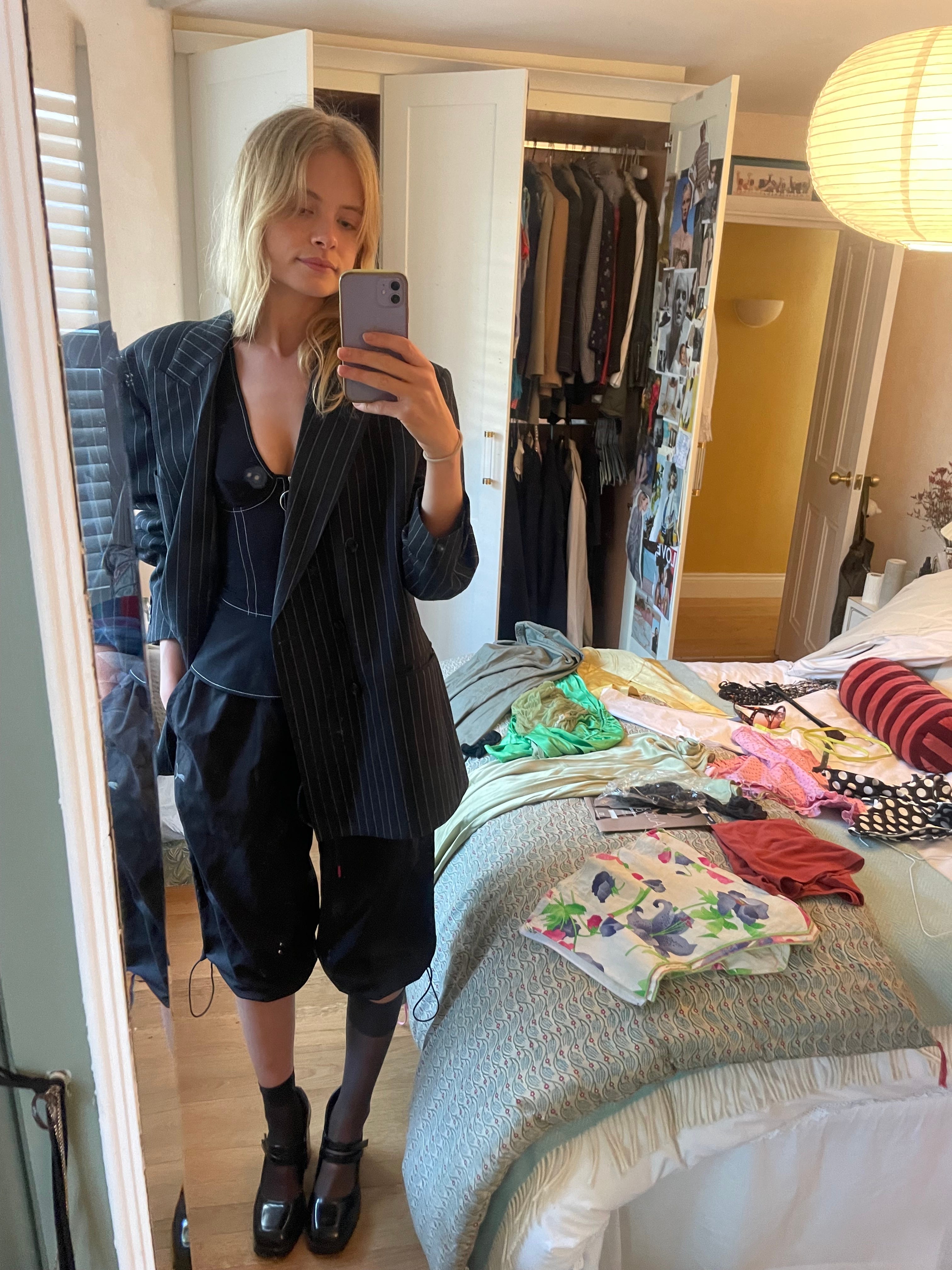 In reality my style centres upon uniform, a literal play on school meets work uniform consisting of some sort of smock dress, a shirt, trouser, blazer combo, sometimes all three at once. The key is that I have to fuck it up a bit. Full uniform is icky, a bit too on the nose. I oscillate hypothetically between Thom Brown tailoring, Miu Miu coquettishness and Simone Rocha punk princess. Alas only Simone actually lives in my wardrobe via Vinted or their holy sample sales. I have been known to queue 3 hours to get my mitts on her gracious designs. Reader, it was well worth it.